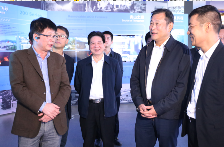 梁伟新一行先行参观了青拓集团营运中心、研究院等场所,姜海洪对企业发展历程、生产经营情况、生产工艺流程等进行了详细介绍。随后,一行人员来到企业生产现场,走访了青拓实业股份400系、青拓物流14#泊位、青拓科技热轧车间、青拓上克冷轧车间等生产线,实地了解企业先进工艺流程、生产规模等情况。