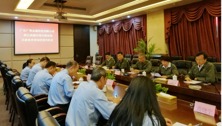 10月24日下午,广东广青金属科技有限公司后勤党支部与阳江高新区地税局党支部在广青科技办公楼会议室举行了“共建优秀党组织”签约仪式。签约仪式由广青科技党总支副书记、监事长王桂域主持。